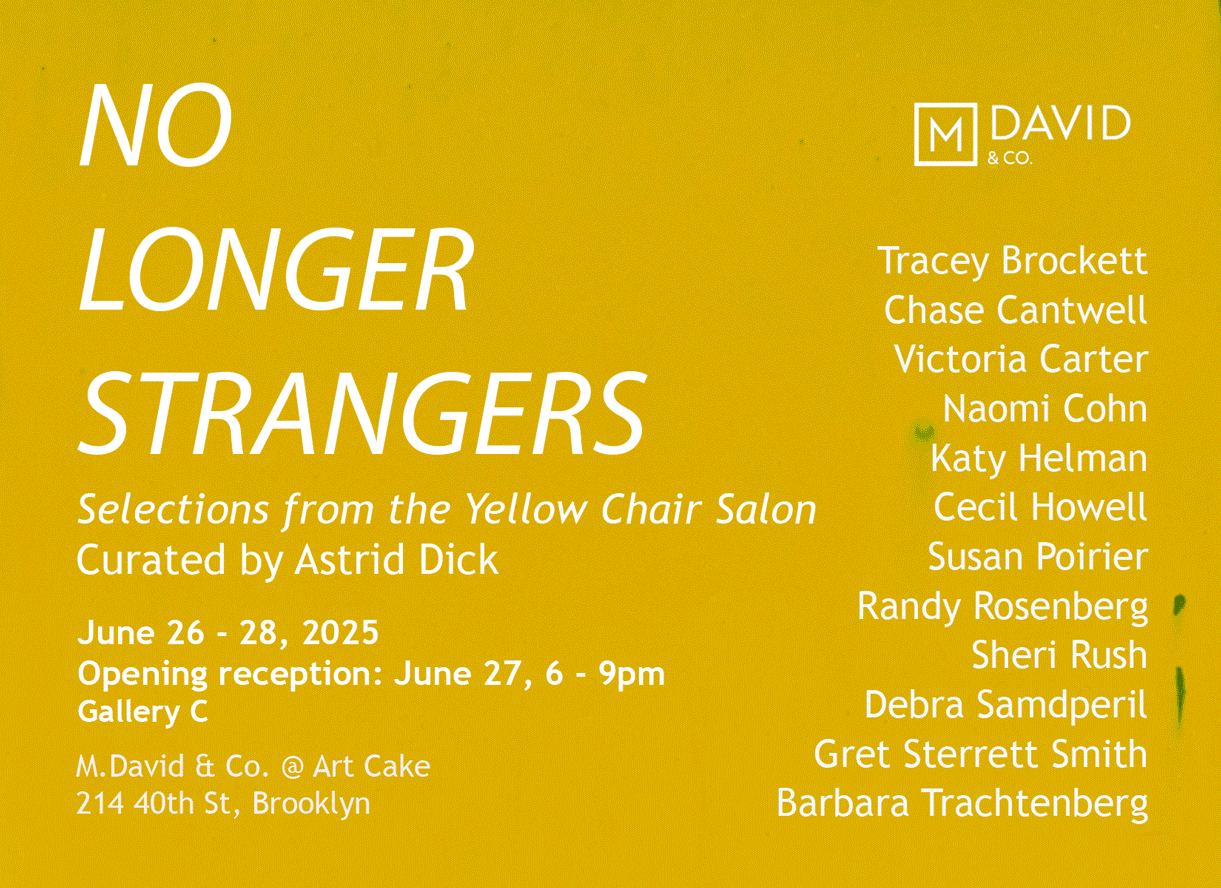 “No Longer Strangers is a celebration of conversations resulting from a coming together, virtually and on Tuesday nights, of twelve artists that joined Astrid Dick during the Spring of 2024 in the context of the Yellow Chair Salon. The importance of idiosyncrasy and the plurality of voices that may or not sing at once, or sing at all. To contemplate the possibility that our own self may contain multitudes of strangers longing to meet.“ Astrid Dick